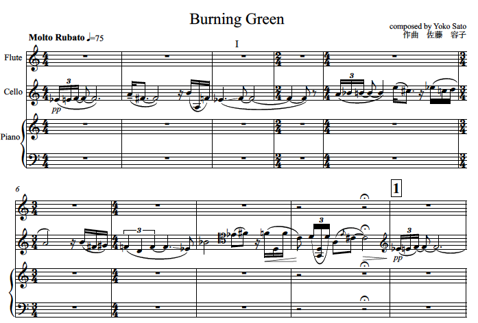 Burning Green フルート、チェロ、ピアノ(Flute, Cello, Piano) 新緑の季節、燃える様な緑の印象をもとに作曲された三楽章形式による三重奏。ハワイ大学音楽学部教員によるTrio Xia による委嘱で、’04年に初演された。(Fl. Frederick Lau, Vc. I-Bei Lin, Pf. Thomas Yee ) Listen https://yokosatomusic.com/wp-content/uploads/2014/07/burning-green-for-web.mp3 いいね 読み込み中…