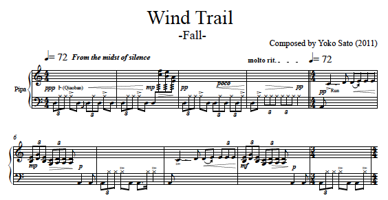 The piece begins with the sound by tapping the body of Pipa, which could evoke the footsteps of the wind. Then, the moderate melodic lines are presented and developed throughout the piece taking various shapes. The tapping sound momentarily comes back during the piece, while ascending and descending melodic figures illustrate the spontaneous flow of the wind itself.